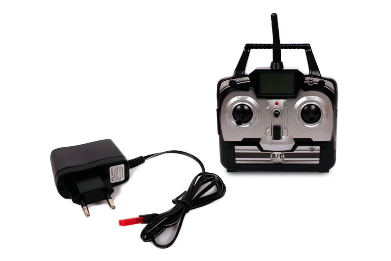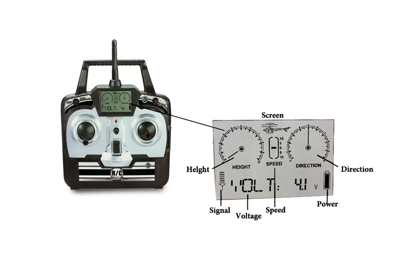 کنترل رادیویی 3.5 کانال با برد 250 الی 300متر مجهز به صفحه نمایشگر که در آن ارتفاع پرواز سرعت مقدار شارژ باقیمانده سیگنال آنتن و سایر اطلاعات هلیکوپتر نمایش داده می شود.