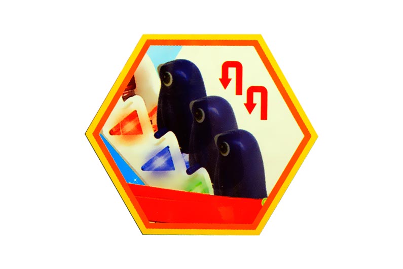 - عروسک های پنگوئن از پله ها بالا می روند و پس از رسیدن به پله ی آخر از یکی از سه نوار گردشی(مانند سرسره) پایین می آیند.